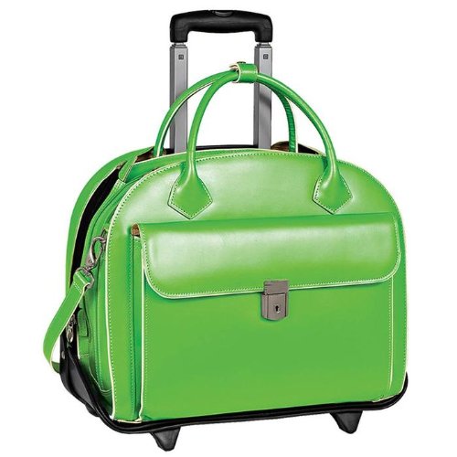 McKlein Glen Ellyn Leather Detachable-Wheeled Womens Case. Roll or carry this Italian Leather Ladies Briefcase with Laptop Sleeve. Patented 2-in-1 Removable Wheel and Handle System. Quick access front pocket is secured with a key lock. Interior organizer also stores media devices, business cards, key holder and pens. Removable high-density laptop sleeve protects laptops up to 15.4" in size. Double compartment divided by secured zipper pocket for important documents. Smart Attachment Strap allows transport on extended handles of other rolling cases. Protective weatherproof cover. Available in a variety of stylish colors. Dimensions: 16.75" x 7" x 13.75" List Price : $329.99Our Price : $240.00